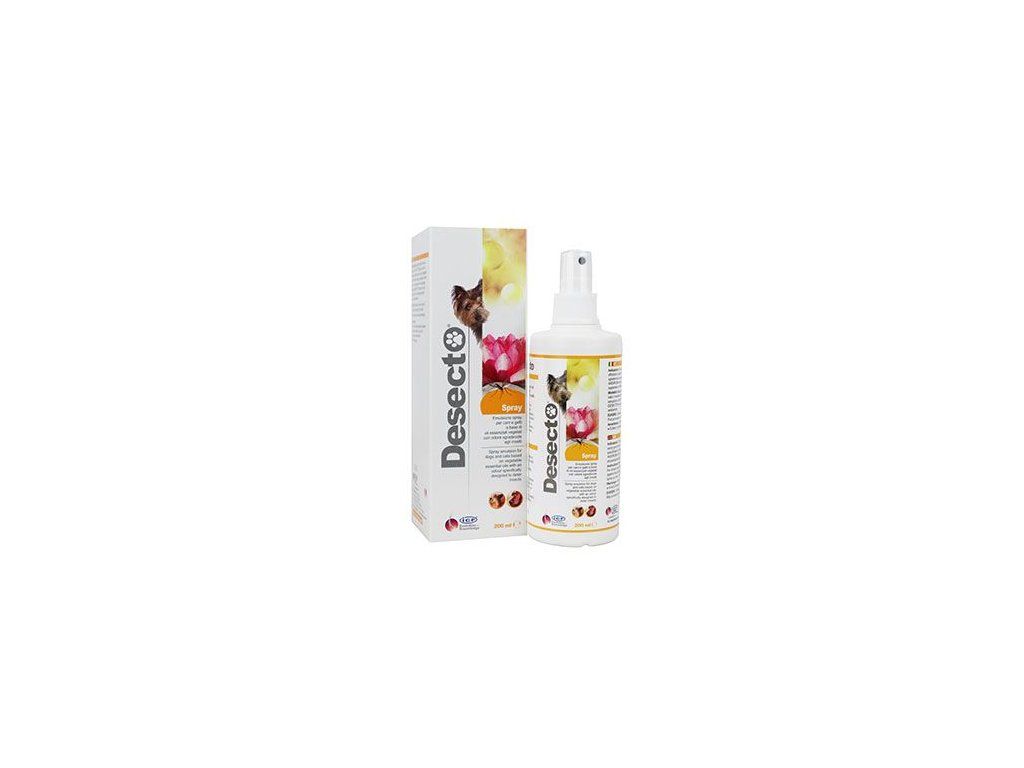 Desecto je repelentní sprejová emulze pro topické použití u psů a koček.