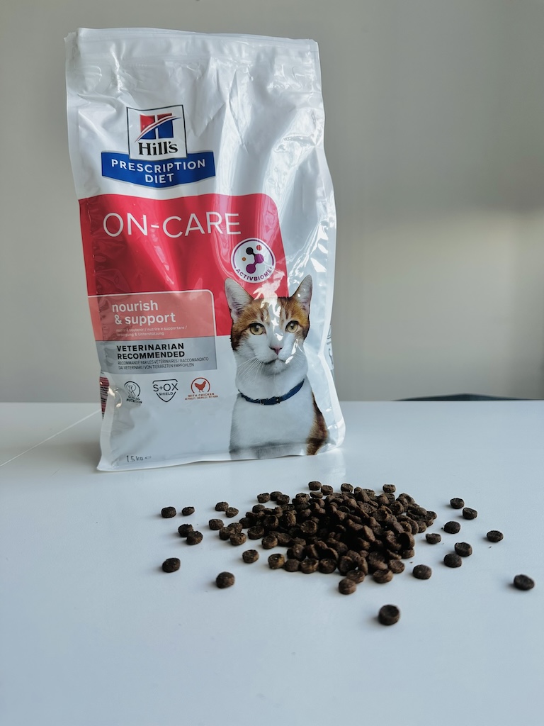 Hill’s Prescription Diet ON-Care je kompletní dietní krmivo pro dospělé kočky, které potřebují nutriční podporu například během nemoci nebo rekonvalescence. Obsahuje více energie a důležitých živin, aby pomohlo kočce udržet dobrou kondici.Pokud si nejste jistí, zda je toto krmivo pro vaši kočku vhodné, poraďte se se svým veterinářem. Ten vám také může doporučit, jak krmivo správně zařadit do jídelníčku, aby z něj vaše kočka měla co největší užitek. 🐾