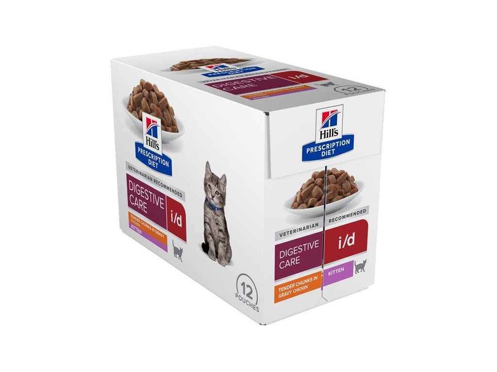 Hill's Prescription Diet Digestive Care i/d Kitten je kompletní dietetické krmivo s kuřetem určené k omezení střevních resorpčních onemocnění a ke kompenzaci špatného trávení a exokrinní pankreatické nedostatečnosti štěňat. Kapsičky se zvýšeným obsahem sodíku a draslíku obsahují vysoce stravitelné ingredience. ActivBiome+ Digestion je patentovaná směs prebiotické vlákniny, u které bylo klinicky ověřeno, že rychle vyživuje střevní mikrobiom, čímž podporuje zdravé trávení a celkovou pohodu kotěte.