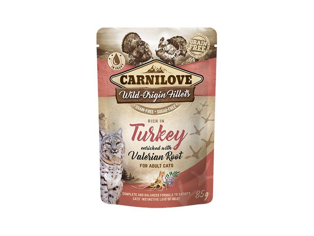Kapsička pro kočky Carnilove neobsahuje žádné obiloviny a cukr. Receptura Turkey je bohatá na maso z krocana a je doplněna o kořen kozlíku. Krocaní filety jsou naloženy ve šťávě. Jedná se o kompletní krmivo pro kočky. Kapsičky pro kočky Carnilove Cat Pouch lze zakoupit v 7 lahodných příchutích.