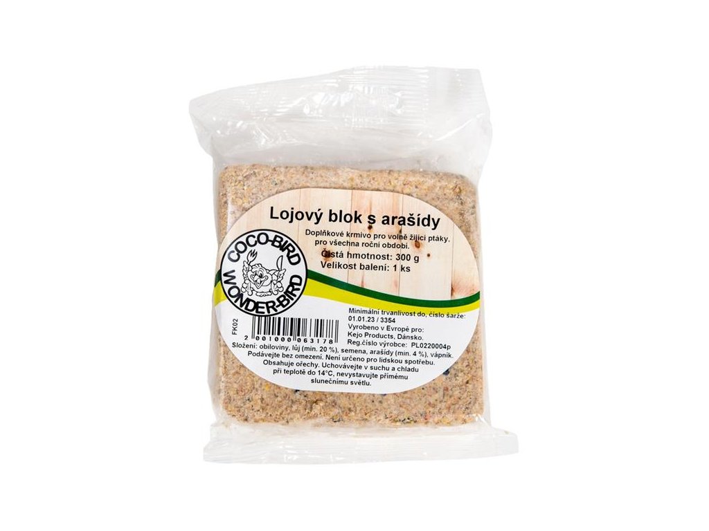 Složení: obiloviny, lůj (min. 20 %), semena, arašídy (min. 4 %), vápník
