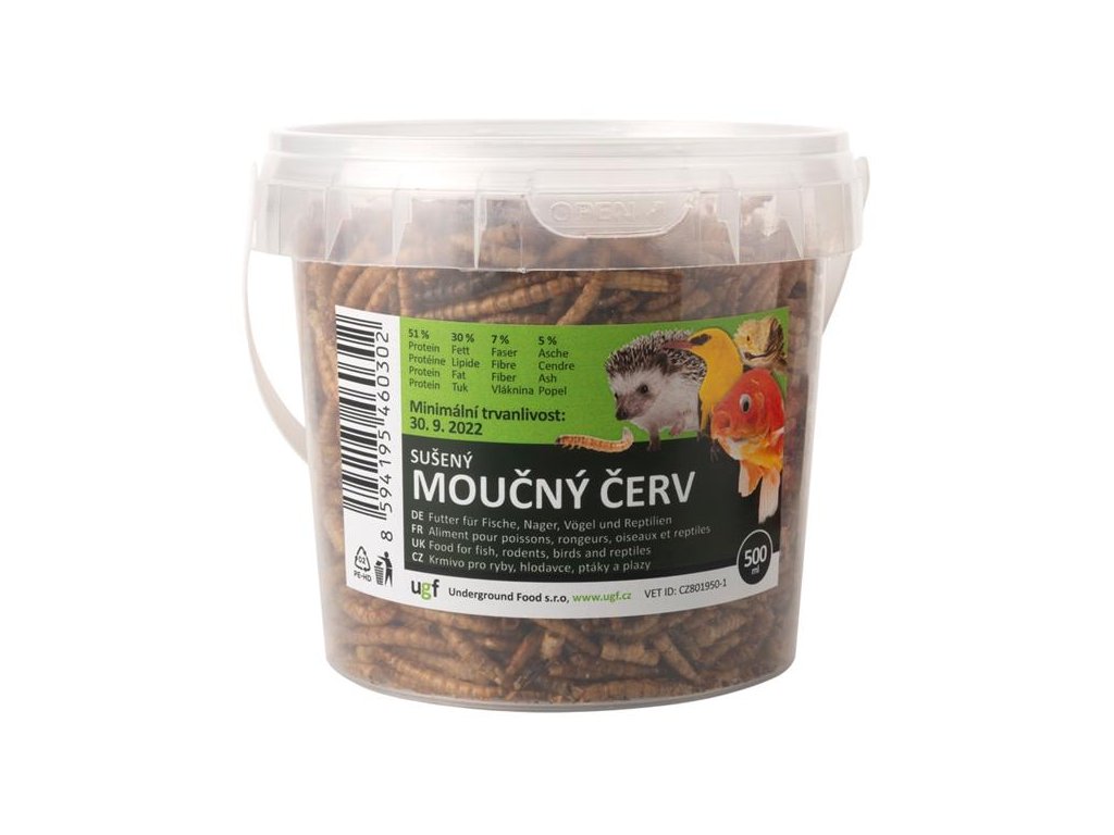 Moučný červ má nejvyváženější podíl proteinů (51 %) a tuků (30 %). Je zdrojem prebiotické vlákniny, vitamínů, minerálů a stopových prvků (komplex B, A, P, Ca, Mg, Fe, Zn). Obsahuje přirozeně se vyskytující taurin, který je nezbytný pro dobrý zdravotní stav zvířat a do krmiv je jinak přidáván synteticky. Podporuje zdravou kůži, srst, drápy, reprodukci i snůšku a posiluje imunitní systém zvířete.