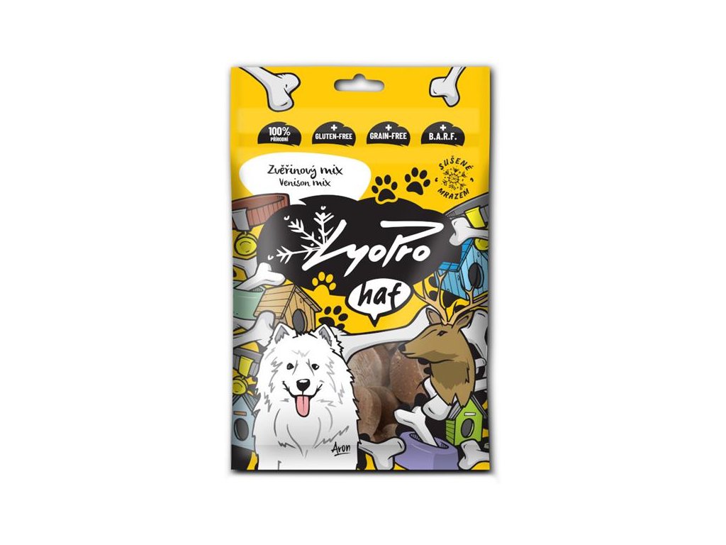 Zvěřinový mix obsahuje důležité složky potravy, kterými jsou maso a vnitřnosti. Pamlsky zlákají nejednoho psa svou křehkostí a neodolatelnou vůní divočiny. Při sušení mrazem (lyofilizaci) neprocházejí suroviny vysokými teplotami, a proto si uchovávají maximum vitamínů, minerálů a nutričně hodnotných látek. Jde o ideální volbu pro BARF (krmení syrovou stravou), psí alergiky a celiaky. Další výhodou sušení mrazem je dlouhá trvanlivost. Pamlsky neobsahují žádnou chemii, obilniny, konzervanty ani jiné balastní látky. Jde tak o zdravou, lehkou a výživnou odměnu.