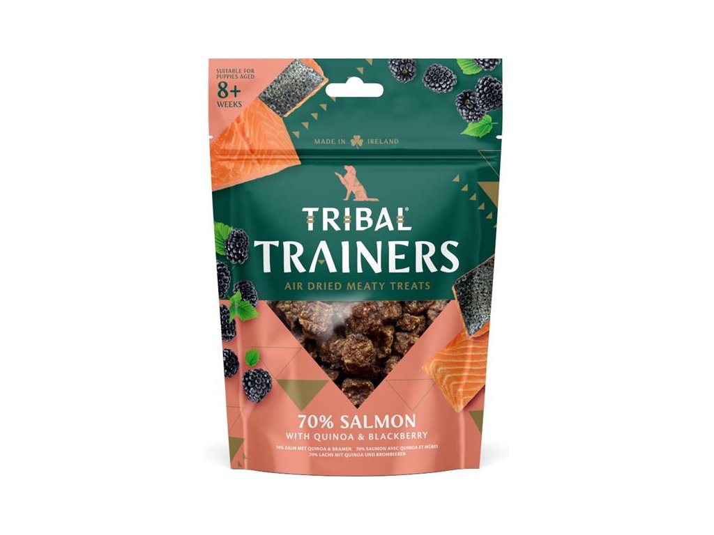 Výcvikové pamlsky Tribal Trainers Salmon & Blackberry jsou připravené z čerstvého lososa a superpotravin, jako jsou ostružiny, které jsou bohaté na antioxidanty a vitamíny. Šetrný výrobní proces – sušení na vzduchu za nižších teplot – zajišťuje, že jsou pamlsky měkké, šťavnaté a plné živin.