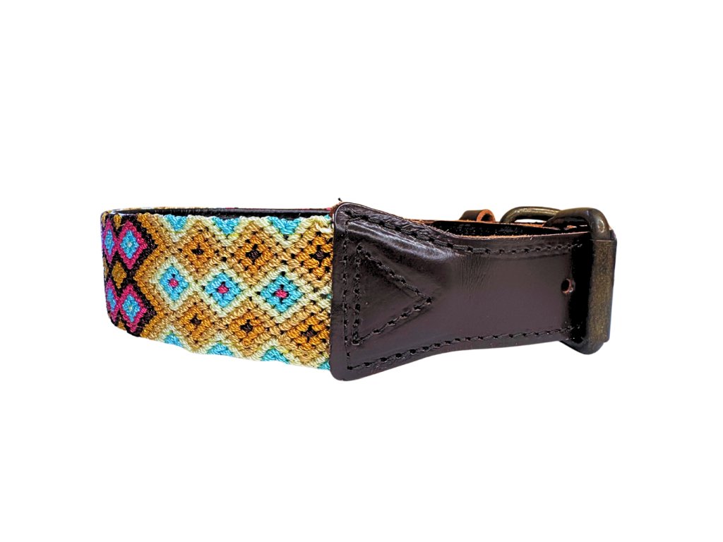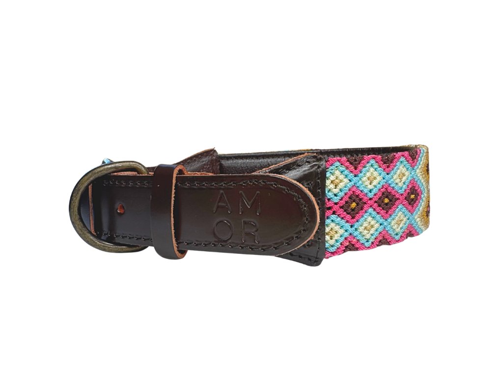 Obojky od AMOR Handmade jsou ručně vyráběny z přírodně činěné kůže a textilních materiálů, které jsou tkané tradičními mayskými technikami.