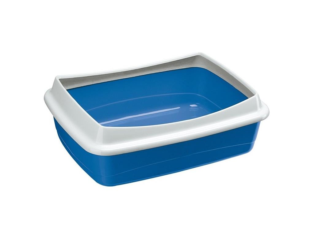 Plastová otevřená toaleta pro kočky se zvýšeným okrajem.