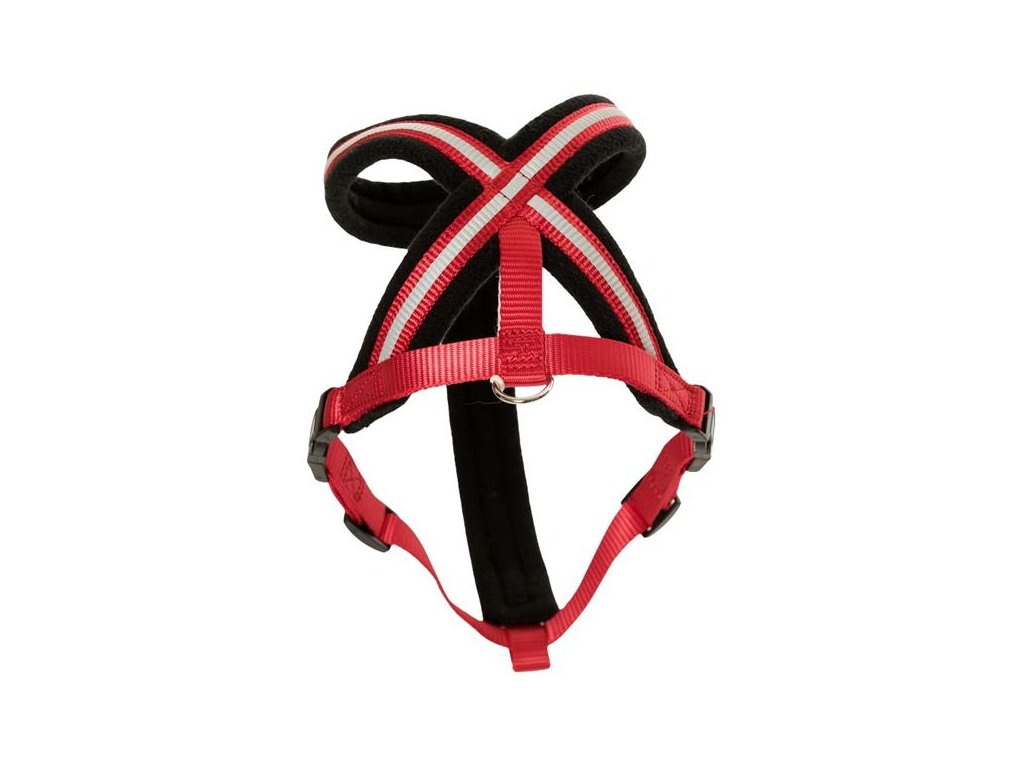 Reflexní nylonový postroj na menšího psa v červeno/černé barvě.