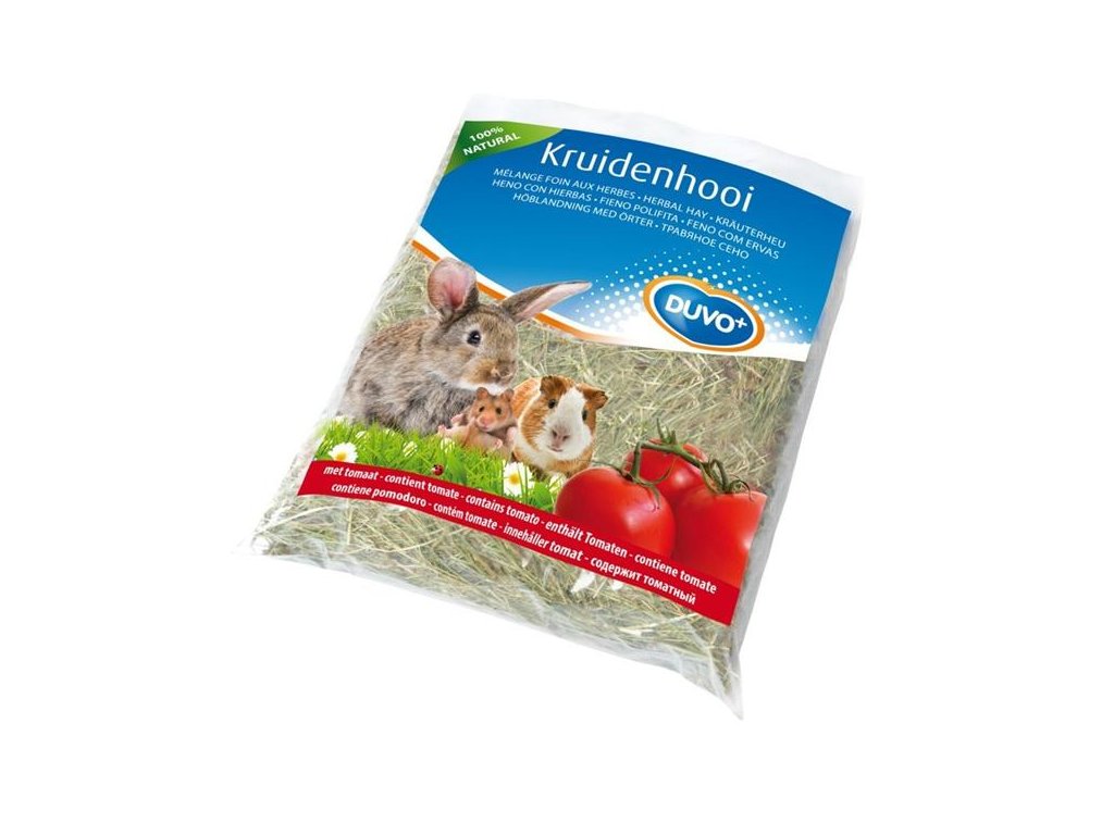 Bylinkové seno Duvo+ s přidanými sušenými rajčaty - doplňkové krmivo pro králíky a hlodavce.